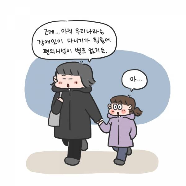 "근데... 아직 우리나라는 장애인이 다니기가 힘들어. 편의시설이 별로 없거든."