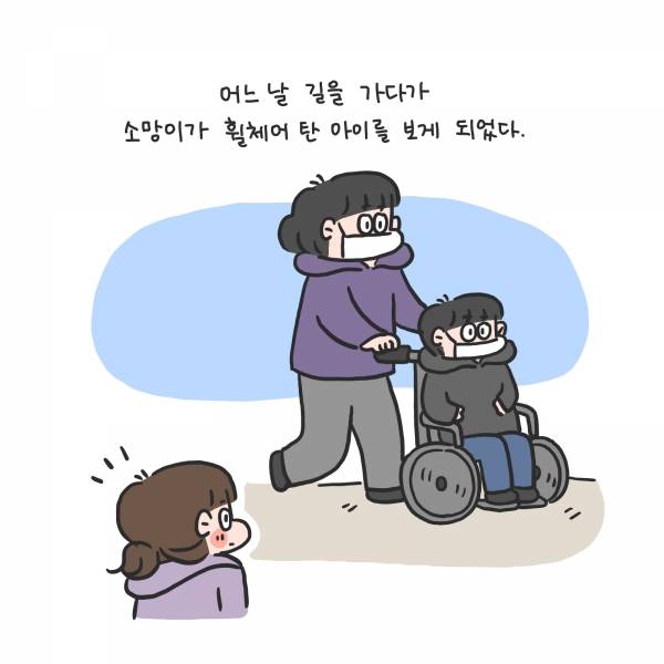 어느 날 길을 가다가 소망이가 휠체어 탄 아이를 보게 되었다.
