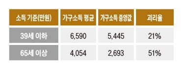 39세 이하의 젊은 계층에서는 가구 소득의 평균값과 중앙값의 차이가 그리 크지 않다. 하지만 노령층에서는 평균값이 중앙값에 비해 51%나 높다. 65세 이상인 노령층 중에서는 소득이 극히 적은 계층도 있지만, 재벌 총수도 있기에 평균값이 현실보다 높게 나오는 것이다.