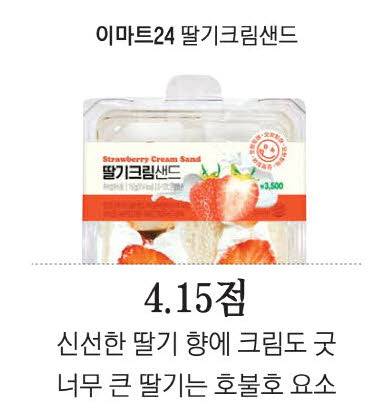 1위는 이마트24에서 내놓은 '딸기크림샌드'가 차지했다. 개인 최고점이자 전체 최고점을 준 김규식 기자는 "딸기향이 아주 강하고 신선하게 느껴져 좋았고, 모양도 사각형이라 먹기에도 편했다"며 "크림과 딸기 균형도 훌륭해 간식 대용으로도 추천하고 싶다"고 소개했다. 먹기 편한 모양에 대한 칭찬은 이어졌다.