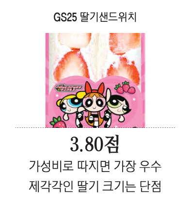 3위를 차지한 GS25의 '딸기샌드위치'는 개성이 크게 강하지 않아 호불호가 덜하다는 평을 받았다. 개인 최고점을 준 안 기자는 "가성비와 딸기 상태 등을 전반적으로 고려했을 때 1등으로 꼽힌다"며 "딸기 함량이 같은 가격대의 제품보다 높다"고 밝혔다. 박 기자는 "파워퍼프걸 패키지가 딸기샌드위치의 이미지와 잘 맞아떨어져 비주얼이 가장 좋다"며 "개성이 강하진 않지만 무난하고 예상 가능한 방향으로 잘 만든 딸기 샌드위치"라고 평했다. 김규식 기자도 "다소 평범한 맛으로 딸기향이 강하지 않은 편"이라면서 "가볍게 우유와 먹을 수 있는 샌드위치"라고 평했다. 반면에 딸기 크기가 균일하지 못하다는 평도 있었다. 박 기자는 "샌드위치에 들어간 딸기의 크기가 제각각인 경우가 많다"며 "어떤 딸기는 너무 작고, 어떤 건 너무 커서 딸기의 존재감이 씹을 때마다 다르게 느껴진다"고 밝혔다.