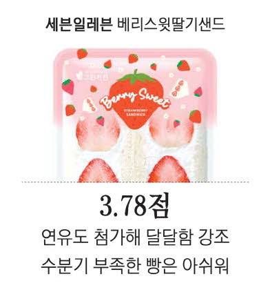 마지막으로 세븐일레븐의 '베리스윗딸기샌드'에 대해선 평가가 엇갈렸다. 개인 최고점을 준 박 기자는 "딸기의 단맛도 높았고, 크림이 비교군 중에서도 가장 완성도가 높았다"며 "크림에 연유를 섞어 당도를 높이면서도 느끼하게 만들지 않았고, 크림이 단단해 식감도 좋았다"며 기본에 충실한 샌드위치라고 답했다.