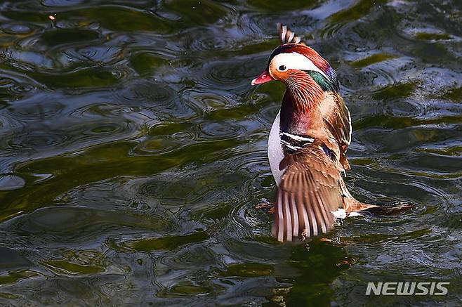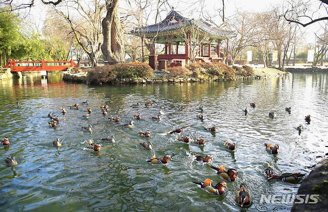 [남원=뉴시스] 김종효 기자 = 전북 남원시 광한루원 연못에 사는 원앙이 겨울철 관광명물로 자리잡았다.