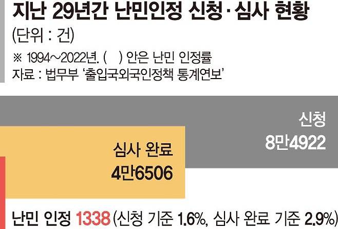 국내에서 난민 지위를 신청해도 인정받는 사례는 극히 드문 것으로 나타났다. 법무부 출입국외국인정책 통계연보에 따르면 지난 1994년부터 2022년까지 난민인정 신청 건수는 8만4922건으로, 4만6506건에 대한 심사가 완료됐고 이 중 난민이 인정된 경우는 1338건으로 집계됐다. 난민 인정률은 신청 건수 기준 1.6%, 심사 완료 건수 기준 2.9%에 불과한 셈이다.