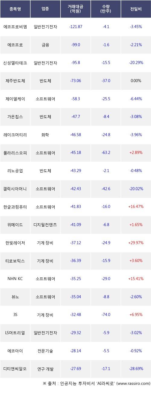 외국인 투자자의 순매도 상위 20개 종목은 에코프로비엠, 에코프로, 신성델타테크, 제주반도체, 제이엘케이, 가온칩스, 레이크머티리얼즈, 폴라리스오피스, 리노공업, 갤럭시아머니트리등이다.