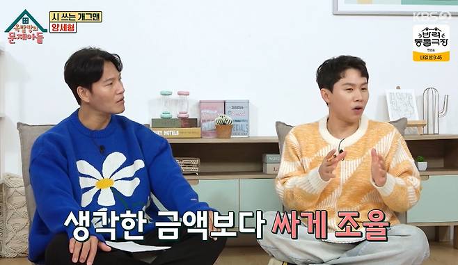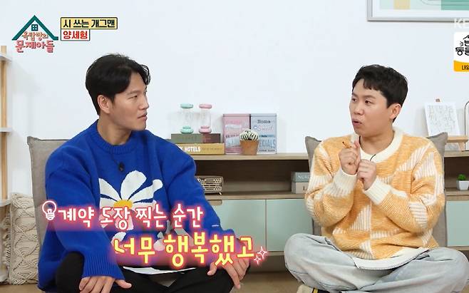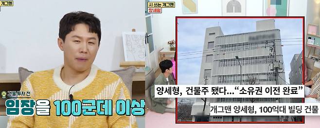 최근 100억 원대 건물주가 돼 화제를 모은 양세형은 건물주가 된 심정에 대해 "100군데 넘게 임장했다. 제 생각보다 싸게 가격이 조율됐다"며 "계약금 보내라고 하는데 그때 심장이 두근거렸다. 내가 진짜 건물주가 된다고 생각이 들었다. 계약서에 도장을 찍고 나니까 정말 기분이 좋더라"라고 말했다.