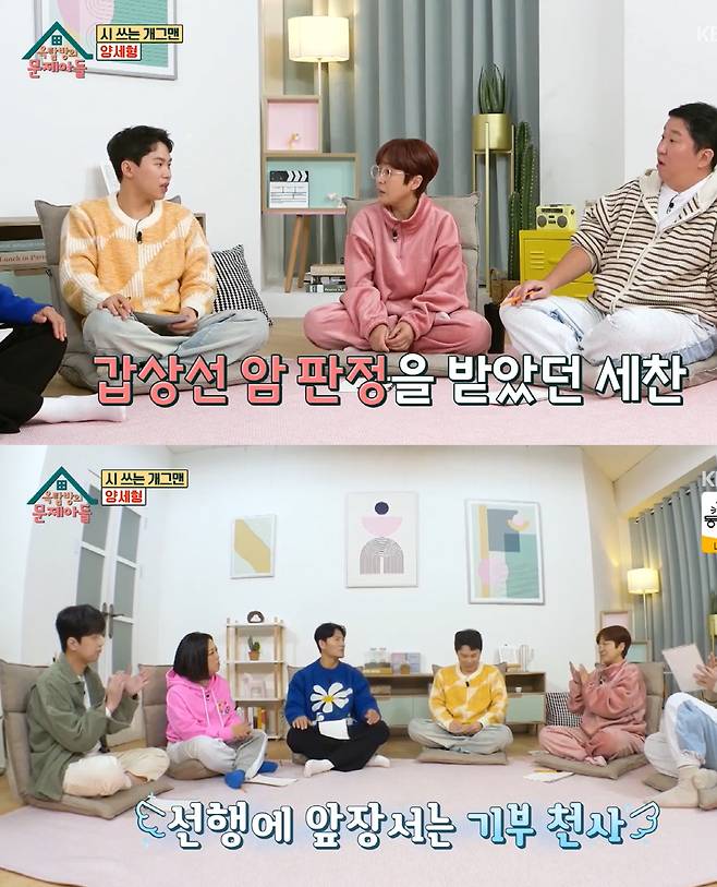 동생 양세찬이 갑상선 암에 걸렸던 당시를 생각하며 가슴을 쓸어내렸다. 양세형은 "동생이 아프다는데 심장이 뛰었다. 몇일을 그 병에 대해서 공부했다"며 "지금도 약 먹으면서 관리중"이라고 전했다. 또한 아픈 동생에게 생명보험 이야기를 꺼낸 것은 형으로서 당황한 모습을 보이기 싫어서 긴장도 풀겸 농담삼아 한 말이었다고 해명했다.