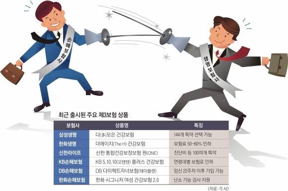 생보사들이 굳이 제3보험 시장에 뛰어든 것은 고령화·저출산으로 생보사 주력 상품인 종신보험의 인기가 시들해졌기 때문이다. 또 제3보험이 새 회계기준(IFRS17)상 실적 상승에 유리하다는 점도 한몫했다는 분석이다. 소비자 입장에서 생보사와 손보사의 경쟁은 반갑다. 같은 값에 더 많은 보장을, 또는 같은 보장을 더 싼 값에 이용할 수 있어서다.