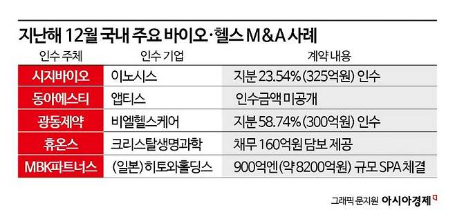 11일 투자은행(IB) 업계에 따르면 지난해 12월 공개된 주요 M&A 계약 21건 중 5건이 제약·바이오, 헬스케어 분야에서 나왔다.