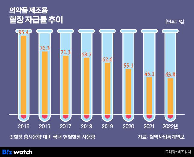 대한적십자사에 따르면 지난해 헌혈자 수는 총 254만1446명으로 코로나19가 창궐하기 전인 2019년보다 8%(24만명) 줄었다. 또 의약품 제조에 쓰이는 혈장 공급량은 2022년 기준 47만4103리터로 2019년보다 15%(8만 리터) 하락했다. 혈장 총사용량 대비 국내 헌혈혈장 사용량을 뜻하는 혈장 자급률은 2022년 43%로 3년 전보다 약 20%포인트 감소했다.