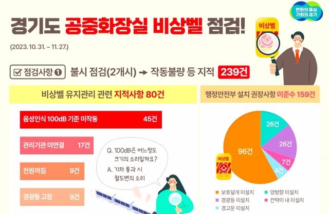 최은순 도 감사관은 "빈번한 범죄 발생으로 안전 사각지대로 인식되고 있는 공중화장실에서 비상벨은 도민을 범죄와 안전사고로부터 지켜줄 수 있는 유일한 예방책"이라며 "이번 감사를 계기로 도내 모든 공중화장실 비상벨이 철저히 관리될 수 있도록 31개 시군에 사례를 전파하고, 앞으로도 도민 생활과 밀접한 분야에 대한 감사를 계속할 계획"이라고 말했다.