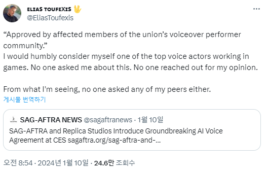 소식을 접한 유명 성우들은 SNS로 SAG-AFTRA의 결정에 우려의 목소리를 냈다. 스타트랙, 데우스 엑스, 스타필드에 참여한 일라이어스 투펙시스는 "SAG-AFTRA는 성우 커뮤니티의 승인을 받았다고 했지만, 업계 최고의 성우 중 하나인 나를 비롯해 내 동료들에게는 아무도 의견을 물어보지 않았다"고 지적했다.