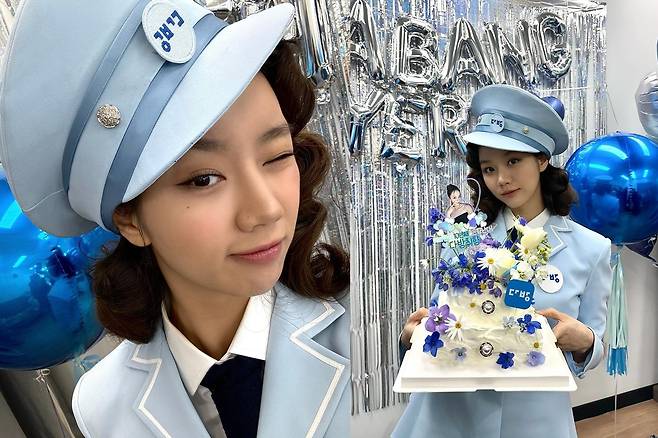 사진 속 혜리는 모자와 재킷을 모두 하늘색으로 맞춰 입은 채 윙크를 하고 있으며 만화처럼 꼬불거리는 헤어스타일이 귀여움을 더한다. 그리고 파란색 계열로 꾸며진 케이크로 통일감을 더했다.