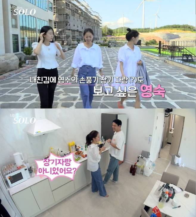 숙소에 들어와 영수를 만난 영숙은 "손선풍기 아줌마 한 번 따라해주면 안 되냐. 그거 보러 여기까지 왔다"고 요청했다. 영수는 "그거 약간 타이밍에 맞춰서 해야 한다"고 돌려 거절했고 영숙은 "장기자랑 아니었냐"고 되물었다. 이에 영수는 "저녁 때 하시죠"라고 밝혔다.