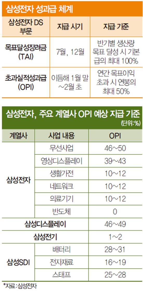 삼성전자 효자 사업이었던 반도체 부문 직원은 이 제도가 생긴 이래 줄곧 전체 사업부 가운데 최고 수준의 OPI와 TAI를 받아왔다. 예를 들어 연봉 6000만원 직원은 연말 TAI 300만원, 연초 OPI 3000만원 등 두둑한 성과급을 받았다. 앞서 2018년 메모리 초호황 직후 이듬해 DS사업부 영업이익이 절반 이상 줄었을 때도 OPI는 29%를 받았다. DS사업부 직원은 2022년 실적을 기준으로 하는 2023년 OPI에서 상한선인 50%까지 지급받은 바 있다.