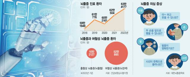 뇌졸중은 세계적으로 3초에 1명씩 환자가 발생하는 흔한 병이다. 국내에서도 매년 13만~15만 명의 신규 환자가 발생한다. 건강보험심사평가원에 따르면 뇌졸중으로 진료 받은 환자는 2018년 59만 1946명에서 2022년 63만 4177명으로 5년새 7.1% 늘었다. 70세 이상이 36만 2586명(57.1%)으로 과반을 차지하지만 60대도 17만 4109명(27.5%)이라 환자가 적지 않다. 뇌졸중은 뇌에 혈액을 공급해주는 혈관이 막혀 뇌조직이 괴사하는 뇌경색(허혈성 뇌졸중)과 뇌혈관이 터져 발생하는 뇌출혈로 나뉜다. 환자의 73%가 발병 후 영구장애가 남을 정도로 후유증 부담도 크다.