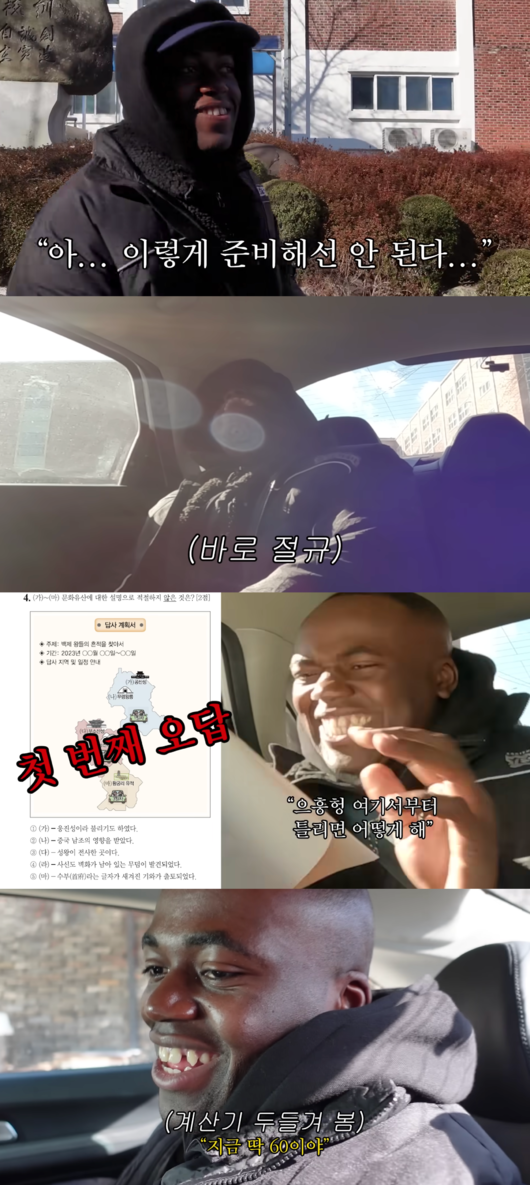조나단은 다행히 입실에 성공했고, 80분간 시험을 보고 나왔다. 시험을 마친 조나단은 조용히 차량에 탑승하자마자 절규를 했고, 그는 “근데 내가 공부를 잘했으면 이런 일은 없었어”라고 말했다.