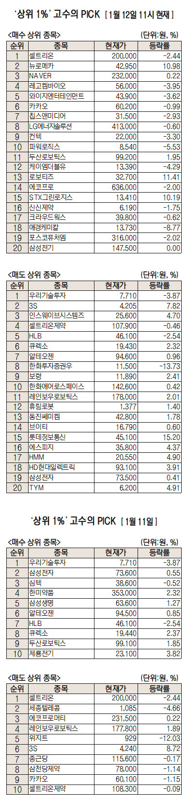 미래에셋증권(006800)에서 거래하는 고수익 투자자들이 12일 오전 가장 많이 순매수한 종목은 셀트리온(068270)으로 나타났다. 뉴로메카(348340), 네이버(NAVER(035420)), 레코켐바이오 등도 순매수 상위권에 이름을 올렸다.
