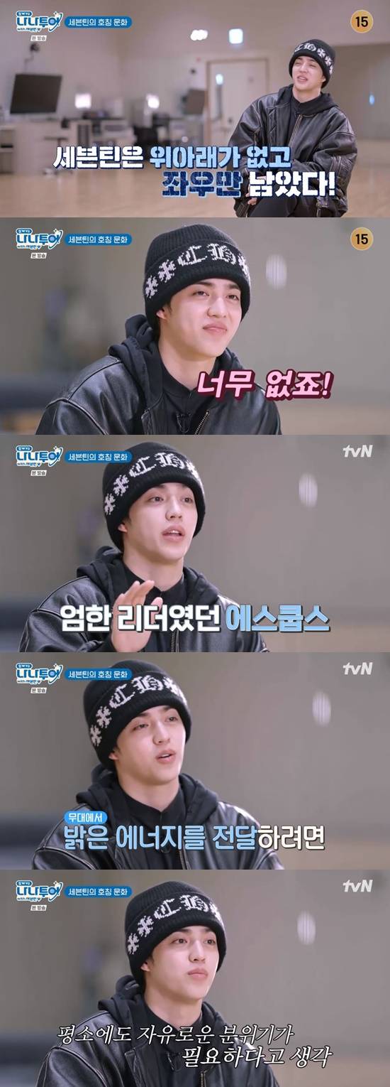 막내 디노는 이에 대해 "리더는 '쎄더넴'(세븐틴의 인사 구호) 하는 사람이고, 막내는 '13 번호 끝!' 하는 사람"이라고 말해 호칭이 무의미한 사이임을 증명했다.