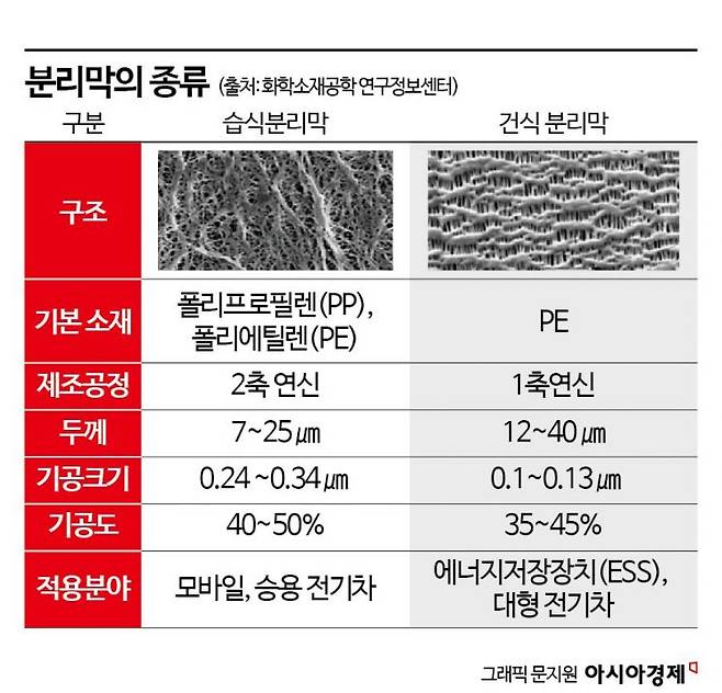 분리막은 제조 공정에 따라 건식 분리막과 습식 분리막으로 나뉜다. 건식은 기계적인 힘으로 필름 원단을 한 방향으로 잡아당겨(1축 연신) 기공을 만드는 방식이다. 제조 공정이 간단하지만 기공 크기가 불균형하다는 단점이 있다.