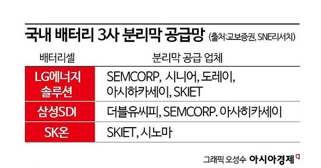 현재 삼성SDI는 더블유씨피로부터 절반 이상의 분리막을 공급받고 있는 것으로 알려졌다. SK온은 주로 SKIET로부터 분리막을 제공받는다. LG에너지솔루션의 거래처는 중국의 상해은첩, 선전시니어, 일본의 아사히카세이, 도레이로 분산돼 있다.