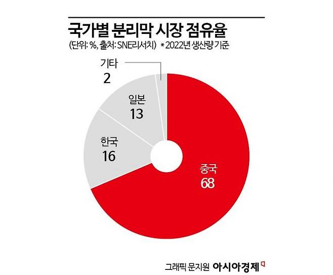 분리막은 과거 일본 기업들이 강세를 보였다. 그러나 최근 몇 년간 중국 전기차 시장이 급속히 확대되면서 중국 기업들이 생산량을 크게 늘렸다. 규모의 경제를 달성한 중국 기업들은 가격을 앞세워 점유율을 확대해 나갔다. SNE리서치에 따르면 2022년 생산량 기준으로 중국이 전 세계 시장의 약 68%를 차지하고 있다. 이어 한국이 16%, 일본이 13%의 순이다.