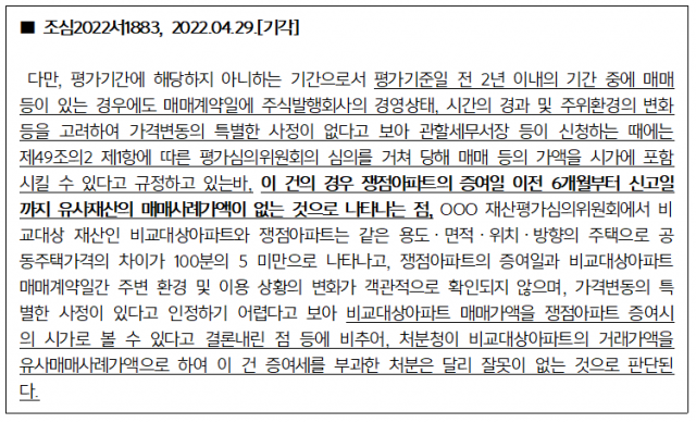 그리고 실제 과세관청은 유사매매사례가액 적용 시 평가기간 예외 규정을 적용하여 납세자에게 과세를 고 납세자는 이에 대해 불복헸다. 그리고 심판원은 아래와 같이 결정했다.
