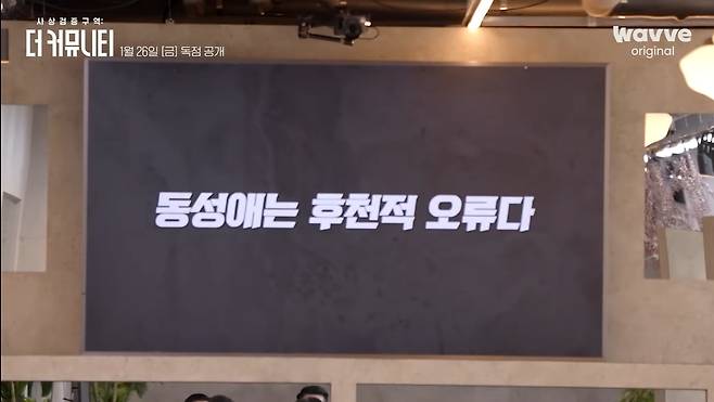 발단은 지난 10일 온라인 동영상 서비스(OTT) 웨이브가 공개한 '더 커뮤니티' 티저 예고편이었다. '정치, 젠더, 계급, 개방성 4개 분야에서 서로 다른 이념을 가진 이들이 벌이는 서바이벌 예능'이라는 취지와 함께 3분 남짓한 예고편에는 "동성애는 후천적 오류다"라는 문구가 토론 주제의 하나처럼 등장한다. 이를 두고 누리꾼들은 "호모포비아(동성애 혐오)에게 발언권을 준다", "타인의 성 정체성을 비하한다", "전제부터 편향됐다"는 비판을 쏟아냈다.