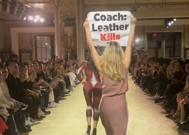 | ▲ 지난해 9월 개최된 뉴욕패션위크에서 세계 최대 동물보호단체 페타(PETA)는 명품 브랜드 코치(Coach)의 런웨이에 난입해 동물 가죽 사용을 반대하는 기습 시위를 벌였다. |