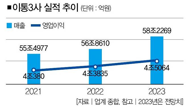 그럼 이통3사의 실적은 어떤 상태일까요? 금융정보업체 에프엔가이드는 2023년 SK텔레콤·KT·LG유플러스 등 이통3사의 합산 매출이 전년(56조8610억원) 대비 2.4% 늘어난 58조2269억원에 이를 것으로 내다봤습니다. 같은 기간 영업이익도 4조3015억원에서 4조5064억원으로 4.5% 늘어날 것으로 전망했죠.