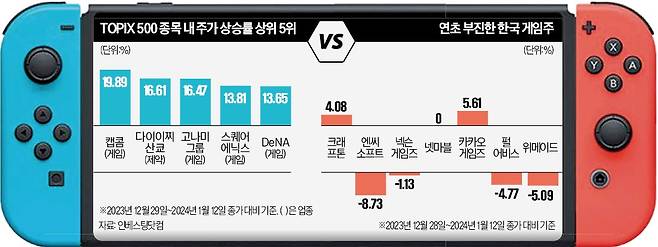 국내 게임주가 지난달에 이어 연초에도 지지부진한 흐름을 보이는 가운데 일본 게임주는 두 자릿수 상승률을 기록 중이다. 도쿄증권거래소와 인베스팅닷컴 등에 따르면 일본 ‘TOPIX 500’ 지수 종목 중 올 들어 12일까지 상승률 1위는 19.8% 오른 캡콤이었다. 이어 고나미그룹이 16.4%로 3위, 스퀘어에닉스가 13.8%로 4위, DeNA가 13.6%로 5위를 차지했다. TOPIX 500 상승률 상위 10개 중 4개가 게임주였다.