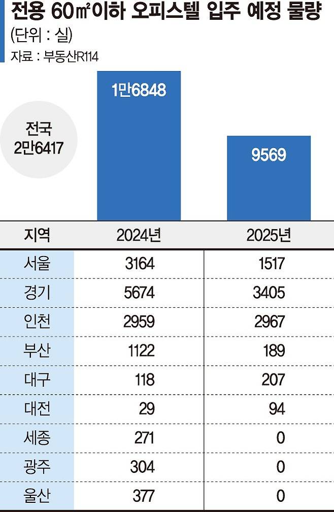 올해부터 내년 말까지 전국에서 입주하는 전용 60㎡ 이하 소형 오피스텔이 2만6000여실 규모인 것으로 조사됐다.
