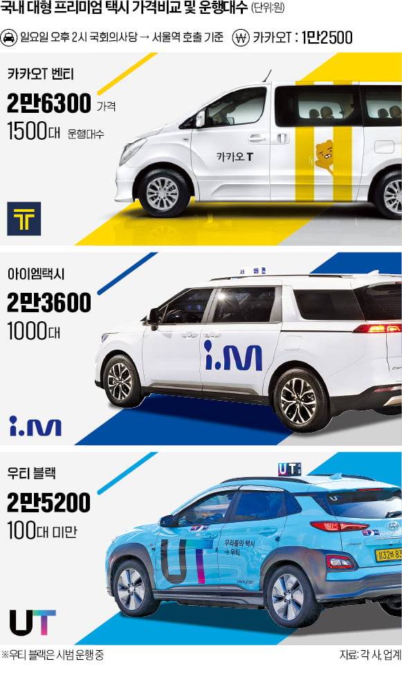 2019년 12월 카카오T 벤티가 서울에서 100대 규모로 시작한 이 시장은 4년 사이 급속도로 성장했다. 서울·경기 지역을 누비는 대형 프리미엄 택시는 최근 3000대를 넘어섰다. 카카오T 벤티가 1500대로 가장 많고 아이엠택시 1000대, 타다 넥스트 500대 순이다. 우티 블랙은 100대 미만으로 시범 운영 중이다. 시장 점유율은 운행 대수와 비슷한 비율로 추산된다. 우티는 대형 승합 대신 고급 세단에 전문 수행 기사를 제공하면서 차별화를 시도하고 나섰다.