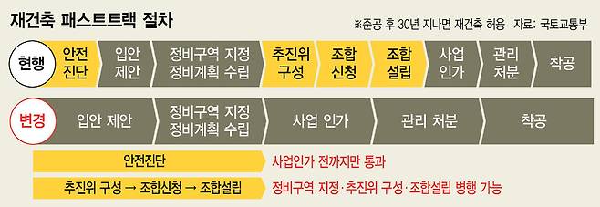 정부는 다음달 ‘재건축 패스트트랙’ 도입을 위한 도시및주거환정비법 개정안을 국회에 제출할 계획인데, 법안 통과를 위해선 야당의 협조가 필요하다. 더불어민주당은 정부의 재건축 규제 완화책 발표 직후 “막무가내식 규제 완화는 집값을 띄울 뿐 아니라 안전성을 최우선으로 하는 도시정비법 취지에 위배된다”는 논평을 냈다. 그러나 지난해 말 분당·일산 등 1기 신도시의 체계적인 재건축을 위한 ‘노후계획도시 특별법’을 여야 합의로 통과시킨 민주당이 신도시 외 지역의 재건축 패스트트랙을 명시적으로 반대하기는 어려울 것이라는 예상이 나온다.