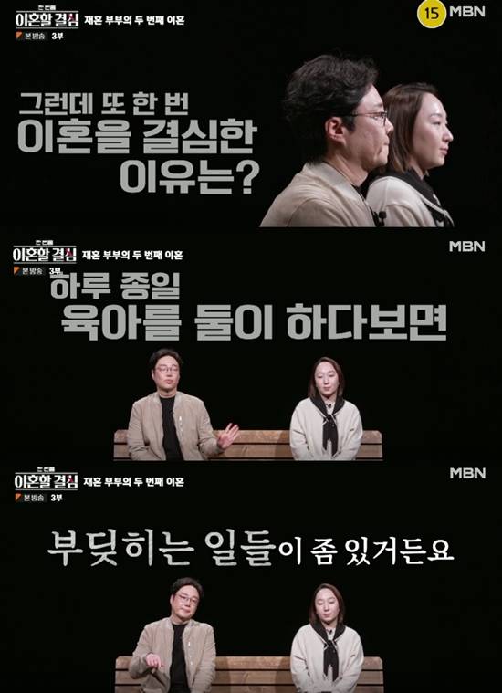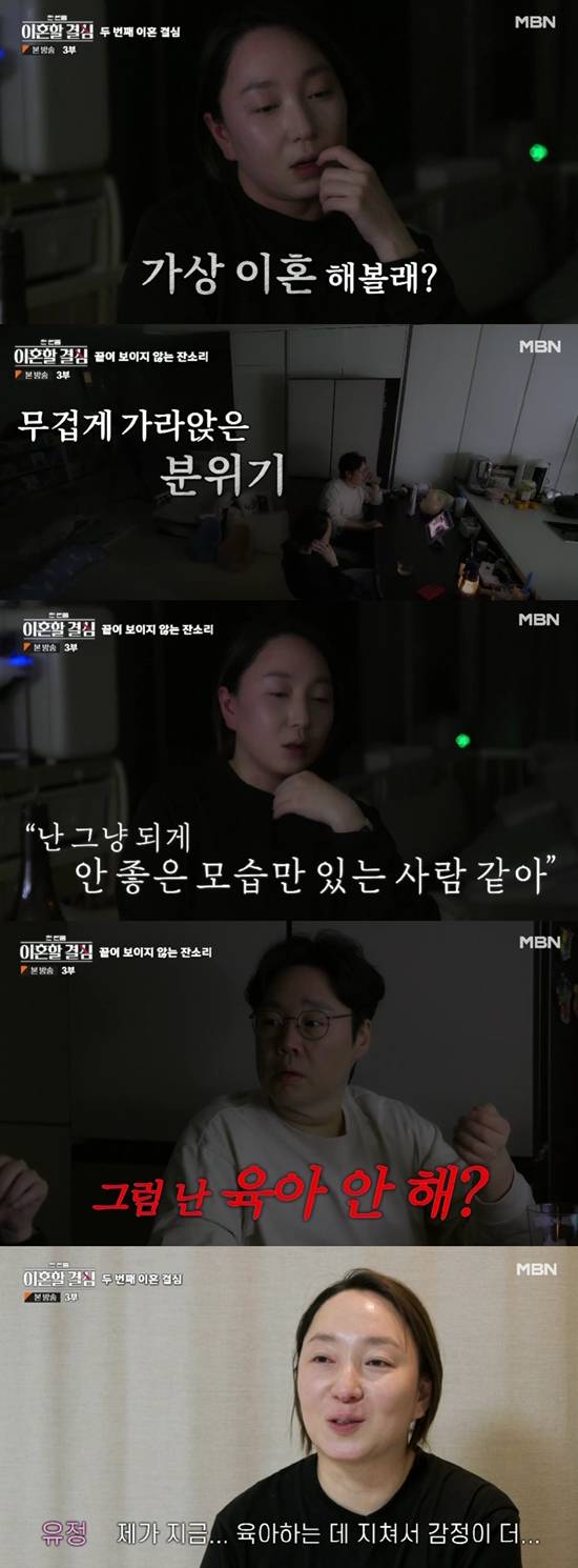 14일 방송된 MBN 신규 예능 '한 번쯤 이혼할 결심'에는 류담 신유정 부부가 전쟁 같은 '쌍둥이 육아'로 '가상 이혼'을 결심하는 과정이 전파를 탔다.