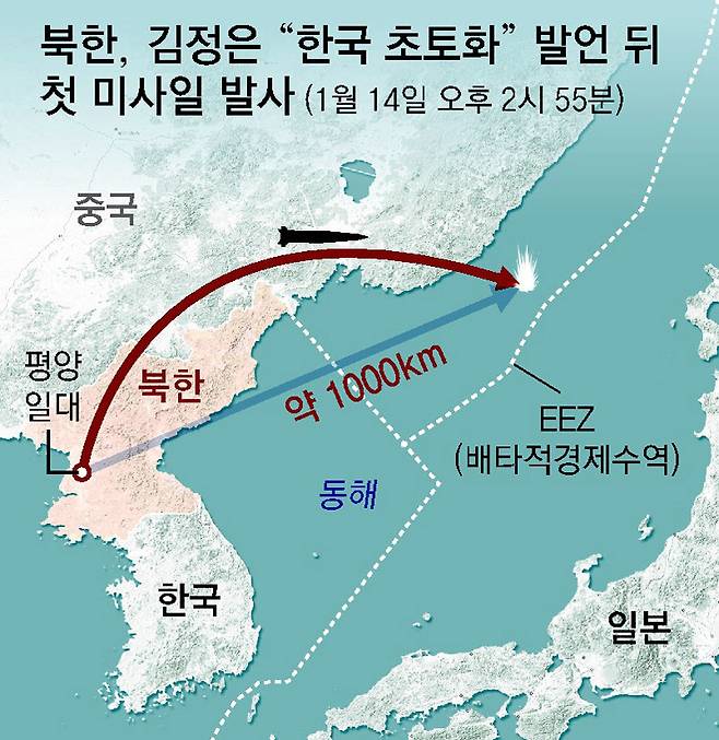 - 김정은 “주적 초토화” 위협뒤 첫 미사일 도발