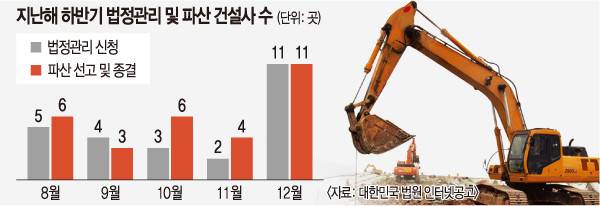 법원에서 파산 선고나 파산 종결(파산 폐지 포함) 결정을 받은 건설사는 지난해 하반기 매달 한 자릿수를 유지하다 11월 4곳에서 12월 11곳으로 뛰었다. 파산 폐지는 채무자인 회사에 현금화할 만한 재산이 없을 때 채권자에 대한 배당 같은 절차 없이 바로 면책 단계로 넘어가는 걸 말한다.