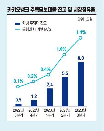 특히 타 은행 대출에서 카카오뱅크 주담대로 대환한 잔고가 2조9000억원에서 4조원으로 증가하며 전체 잔액 내 비중이 51%를 기록했다. 은행권 내 카카오뱅크의 시장점유율도 1%에서 1.4%로 뛰었다. 금리를 낮추고 시장점유율 확대에 나선 전략이 통한 것이다.