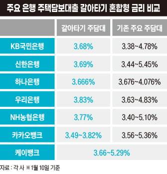 다른 은행도 상황은 비슷하다. 은행별로 ‘대환용 주담대’ 혼합형 금리를 △신한은행 3.69% △하나은행 3.666% △우리은행 3.83% △NH농협은행 3.77%로 제시했다. 하나은행은 주력 상품인 하나원큐아파트론의 최저금리(3.676%)보다 금리가 낮다.