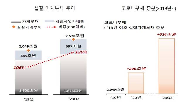 자영업자 대출뿐만 아니라 가계대출 역시 추가 대출이 추가 부실을 부르는 부채 함정에 빠진 상태다. 자영업자대출을 포함한 실질 가계부채(개인사업자대출 + 가계부채)는 2019년 2049조 원에서 2023년 3분기 2573조 원으로 늘어났다. 2019년 이후 발생한 코로나 부채만 무려 524조 원에 달한다.