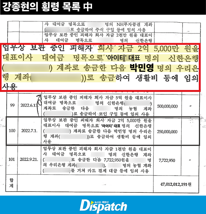 '디스패치'는 강종현 관계사의 회삿돈이 박민영 개인 계좌로 입금된 사실을 확인했다.