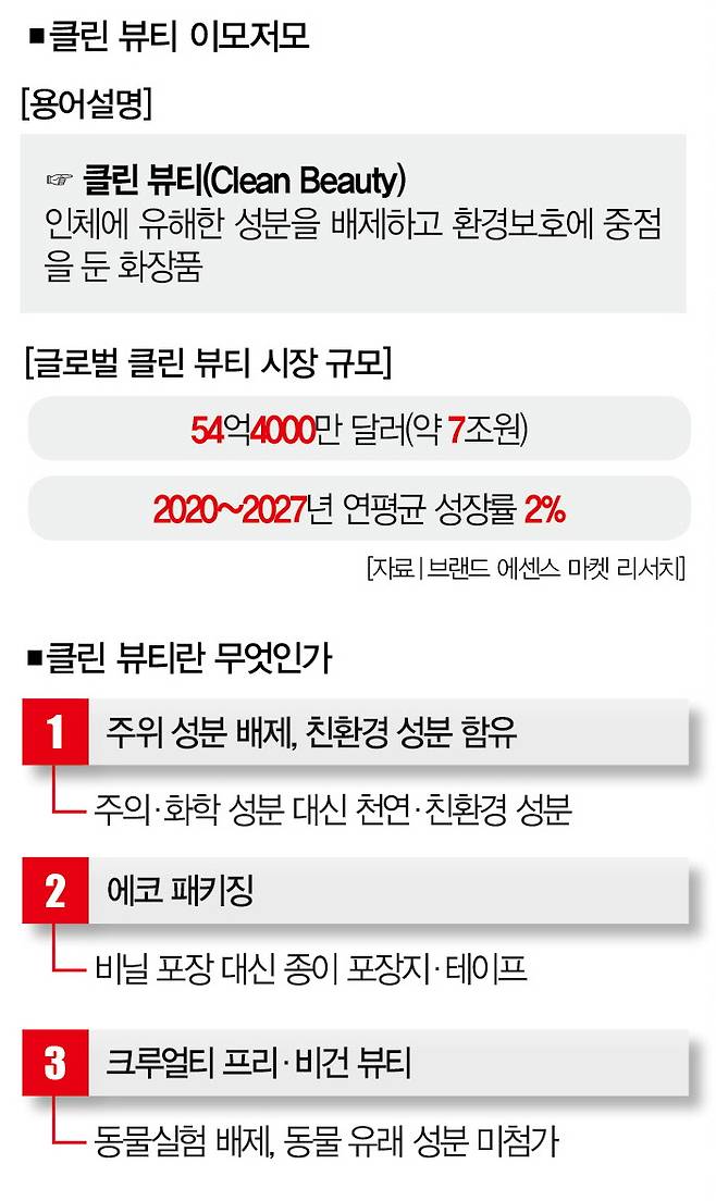 친환경을 강조한 '클린 뷰티(Clean beauty)' 이슈가 화장품 시장을 여전히 뜨겁게 달구고 있다. 클린 뷰티는 인체에 유해한 성분을 배제하고 환경보호에 중점을 둔 화장품을 의미한다. 클린뷰티 이슈가 본격적으로 떠오른 2020년엔 화장품 성분의 '유해성분 배제'만 간주했지만, 점차 동물성 원료를 배제하고 친환경 포장재를 사용하는 것으로 확대했다.