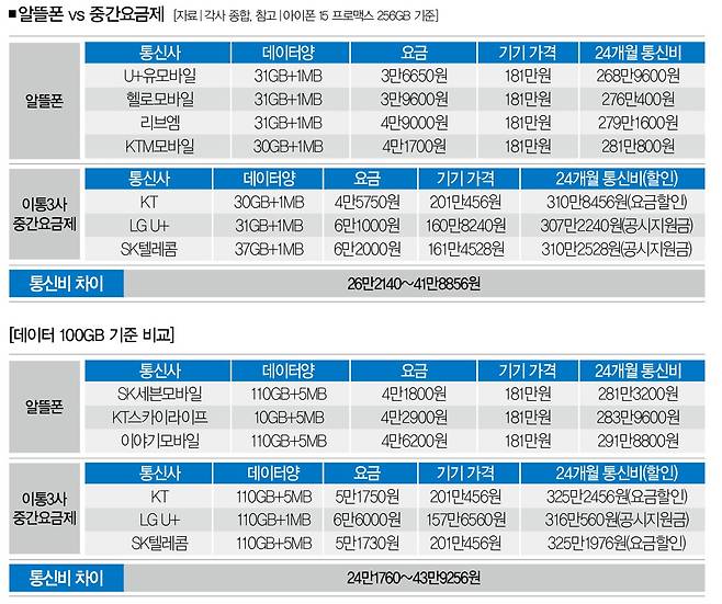 그렇다면 중간요금제는 왜 목적을 달성하지 못한 걸까. 답을 찾기 위해 우리는 통신비 절감의 또다른 대안으로 떠오른 알뜰폰 요금제와 비교해봤다. 비교에 사용한 휴대전화는 출고가가 190만원인 애플의 아이폰15 프로맥스(256GB)다. 최신 스마트폰을 사용할 때 이통3사와 알뜰폰 중 어느 곳이 더 유리한지 살펴보기 위해서다.