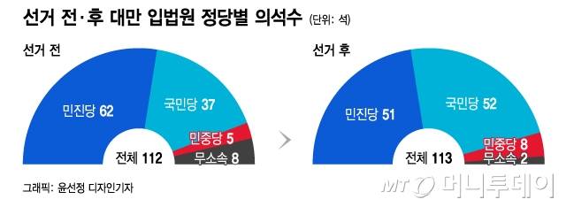 대만 입법원 정원은 113석으로 지역구 입법위원 73석, 비례대표(지역무구분 위원) 34석과 원주민 대표 6석으로 구성된다. 민진당은 선거 전 62석에서 51석으로 11석 줄었고 국민당은 37석에서 52석으로 15석 늘렸다. 15일 대만 연합보는 무소속 2석도 국민당 소속이었다가 무소속으로 출마한 후보라며 국민당 의석을 54석으로 소개했다.