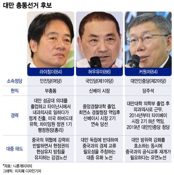 지난 13일 제16대 대만총통 선거에서 친미·독립 성향의 라이칭더(64) 집권 민진당 후보가 득표율 40.05%로 대만 총통에 당선됐다. 친중 성향의 허우유이(66) 국민당 후보와 중도 성향의 커원저(64) 민중당 후보는 각각 득표율 33.49%, 26.46%를 기록했다.