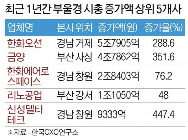 이외에 반도체 패키지 기판을 제조하는 해성디에스(79.3%↑·경남 창원), 한화에어로스페이스(76.2%↑), 리노공업(48%↑), 현대위아(27%↑·경남 창원), SK오션플랜트(12.6%↑·경남 고성), BNK금융지주(10%↑·부산 남구)는 최근 1년 동안 시총이 10% 이상 상승한 상장사들이다. 오일선 한국CXO연구소 소장은 “지난해 부울경의 2차 전지, 조선 및 항공 관련 기업들이 시총 증가에 견인차 역할을 했다”고 설명했다.