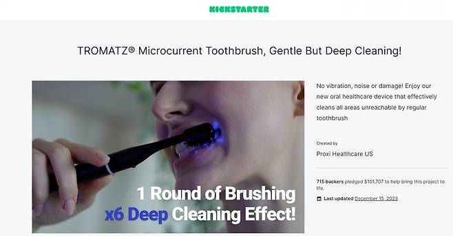 생체전류 칫솔 트로마츠를 개발한 스타트업 프록시헬스케어가 미국 크라우드 펀딩(킥스타터)에서 목표 금액의 20.3배를 달성했다. 최종 펀딩 금액은 10만1707달러(1억3000만원)로 목표 금액인 5000달러를 크게 넘어섰다. 트로마츠 칫솔은 사람 몸에 흐르는 수준의 전류를 기반으로 플라크를 제거하는 기술이 적용됐다. 물리적 방법과 달리 치아 표면에 해를 끼치지 않는다.