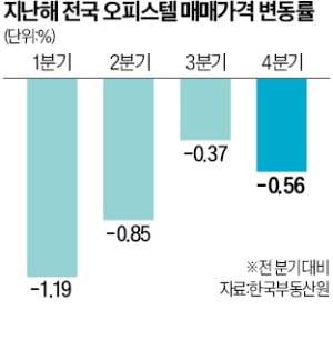 15일 한국부동산원에 따르면 작년 4분기 전국 오피스텔 매매가는 3분기에 비해 0.56% 내렸다. 하락 폭도 작년 3분기(-0.37%)보다 확대됐다. 대표적인 수익형 부동산인 오피스텔은 2022년 2분기까지 상승세를 보이다 금리 인상이 본격화한 같은 해 3분기 이후 하락세를 이어가고 있다.