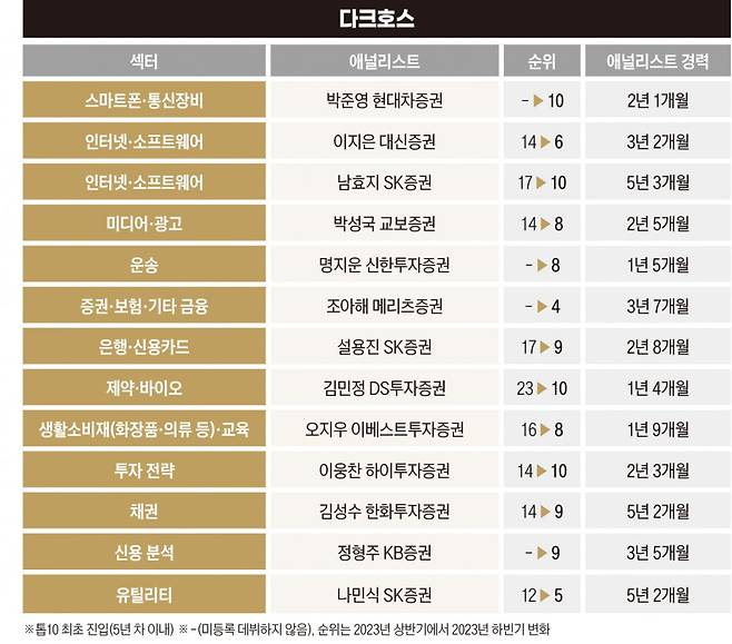 각 부문에서 빠르게 실력을 발휘하며 순위권에 진입한 신예들은 ‘다크호스’에 선정했다. 경력 만 5년 차 이하인 애널리스트 중에서 10위권 안에 새롭게 진입한 이들이다. 메기는 지난 조사와 비교해 3계단 이상 뛰어오르며 톱5에 진입한 관록의 애널리스트들이다.