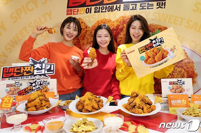 (서울=뉴스1) 황기선 기자 = 16일 서울 마포구 굽네 플레이타운에서 모델들이 굽네의 신제품 '맵단짠 칩킨'을 소개하고 있다.